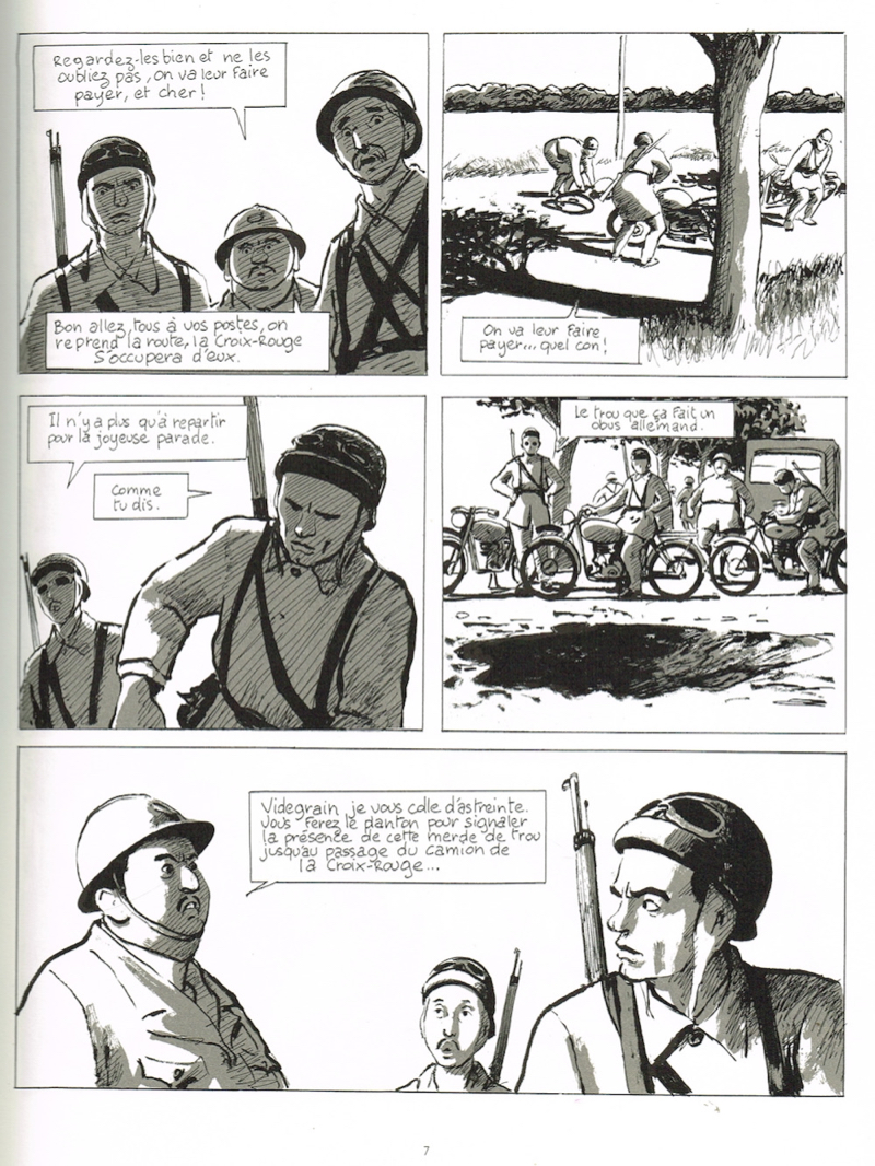 D’une écriture sobre et parfois crue, Pascal Rabaté ravive notre mémoire sur cette période noire et porte un regard sensible sur la débâcle de 1940, conjuguant dialogues à tableaux muets où le dessin révèle tout, même l’indicible. Il rend un bel hommage à ceux qui ont continué à vivre en ces temps de guerre, prenant le parti de rire des pires situations, l’option sans doute la plus salvatrice et celle qui fédère encore au mieux les hommes entre eux. Et nous, qu’aurions-nous fait alors ? Soldat du 11e régiment, Videgrain est à moto, sur les routes… les Allemands ont enfoncé tous les fronts. C’est la débâcle. Les Stukas bombardent en piqué les populations civiles et militaires qui fuient l’avancée allemande. La route est jonchée de cadavres. Videgrain est chargé de veiller les corps sans vie de ses camarades massacrés par les avions ennemis. Mais alors qu’il peut enfin rejoindre son régiment, il s’aperçoit qu’une balle a percé le réservoir de sa bécane. Commence alors un voyage bien étrange où le burlesque côtoie le drame d’un pays en guerre, une France meurtrie, à l’heure de la défaite éclair de son armée. À l’heure où les hommes devraient moissonner les blés, ils creusent des trous pour y déposer les dépouilles des infortunés, et, sous le soleil de juin, cassent la graine entre deux cercueils qui font office de table de jardin. Une partie de campagne bien étrange où les hommes sont devenus croque-morts bien malgré eux, et continuent de croquer la vie, coûte que coûte.