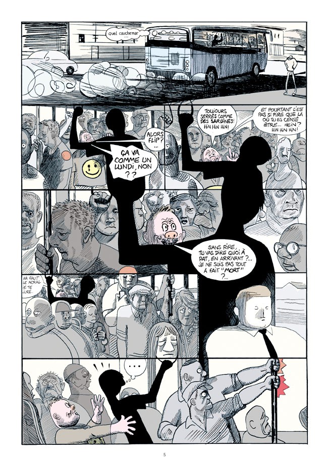 Un lundi matin comme beaucoup d'autres. Flip, le réveil difficile, doit s'apprêter pour aller travailler à l'usine Deleter, leader européen de l'ouvre-boîte et de la clé à sardines. Telle une ombre, pas encore réveillé, le voilà dans le bus, entouré de ces collègues. C'est l'heure de pointe. Pendant le trajet les rumeurs sur la fermeture prochaine de l'entreprise sont au centre des conversations. A l'arrêt prévu tout le monde descend. Sauf Flip. Arrivé au terminus, il fait du stop pour rentrer chez lui. Une grosse limousine passe alors sur la route. C'est le patron de l'entreprise, Deleter, qui s'enfuit. Car, ce matin-là, les rumeurs de vente sont confirmées. Les salariés ont découvert les locaux vidés, les machines vendues et déplacées, et une pile de lettres de licenciement déposée sur le seuil à l'attention des salariés. Flip est pris en stop par Trashy, musicien de djembé en route pour un concert dans la montagne. Flip décide de le suivre. Ainsi démarre un road comics pas comme les autres, halluciné et drôle. David Prudhomme joue avec tous les codes de la bande dessinée pour nous entraîner à la suite de Flip, Trashy et tous les autres protagonistes de cette histoire folle menée tambour battant.