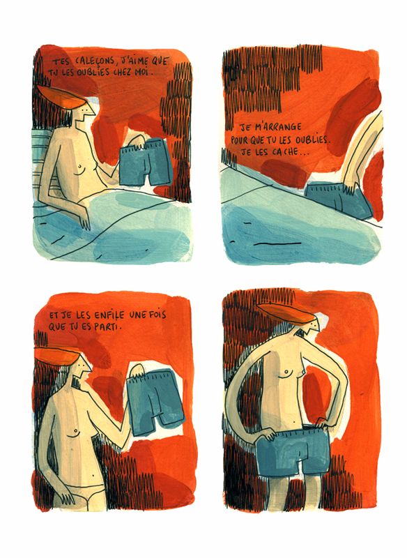 Suite de pensées intimes de l'auteure mises en images par Barroux sous forme de gaufriers de quatre cases sans cadre, aux couleurs vives, colorées et éclatantes exprimant le côté vivant et lumineux du quotidien : les rires, les absurdités, la profondeur, la pudeur, l'impudeur, les coquineries, la poésie. Chaque pensée se termine par un "J'aime..."