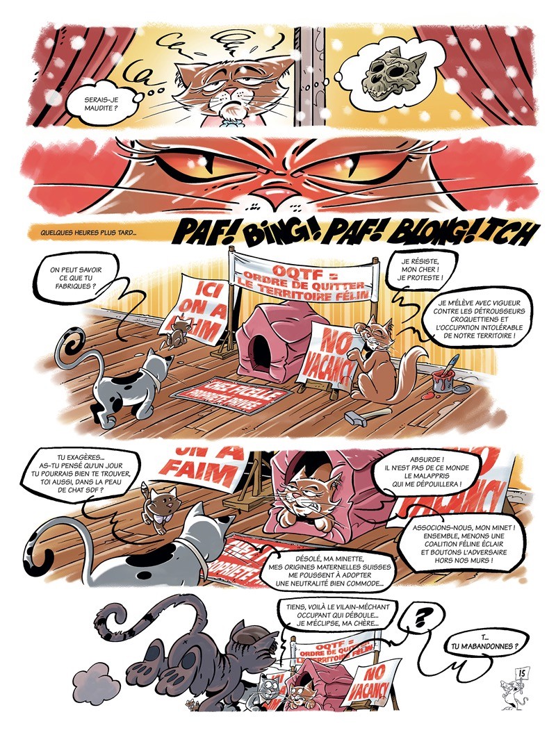 Ces deux chats domestiques mènent une existence simple et tranquille. Du moins, c’était le cas jusqu’à l’arrivée, dans leur petit monde, d’une bande de matous réfugiés. Une cohabitation imprévue qui chamboule, peu à peu, tous les repères…