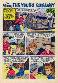 The Rifleman (L'homme à la carabine) est une série télévisée américaine en 168 épisodes de 30 minutes, en noir et blanc, produite par Arnold Laven d'après un scénario de Sam Peckinpah et diffusée entre le 30 septembre 1958 et le 8 avril 1963 sur le réseau ABC. Western Publishing, comme à son habitude, publie une adaptation en comic. Le premier numéro dans la série Four Color (voir cette collection sur le site), puis sous son propre titre partant du N°2 jusqu'au N°12 (par Dell comics) et du N°13 jusqu'au 20 (par Gold Key)