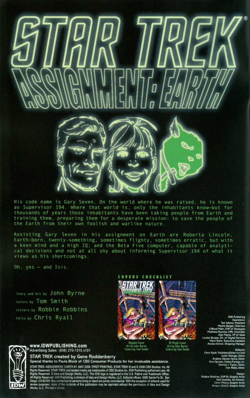 Star Trek: Assignment: Earth is a five-issue comic mini-series featuring the adventures of Gary Seven and Roberta Lincoln. This is the third of IDW's "Second Stage" releases. Written and illustrated by John Byrne, the mini-series acts as a sequel of sorts to "Assignment: Earth". The first issue is set in 1968, with the other four issues each taking place a year after the prior issue.