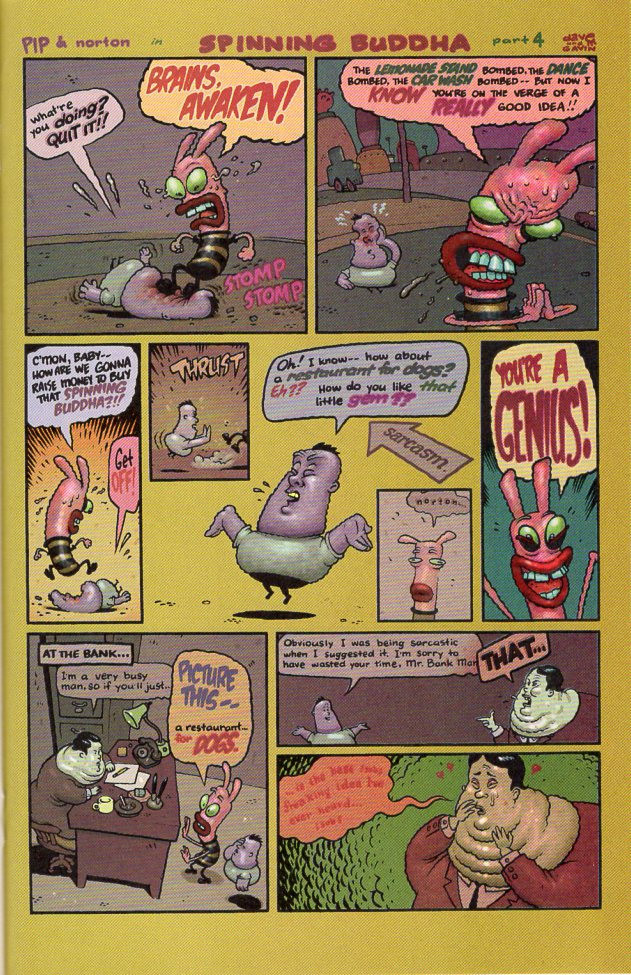 A constant presence in this four-issue mini-series is the thoroughly weird Pip and Norton, a strip about two friends. Norton is a laid-back, easygoing, nearly comatose purple guy, and Pip is an exuberant, manic, orange character needing continual instant gratification. Their interaction amply fulfills the Funny Ha-Ha! requisite.