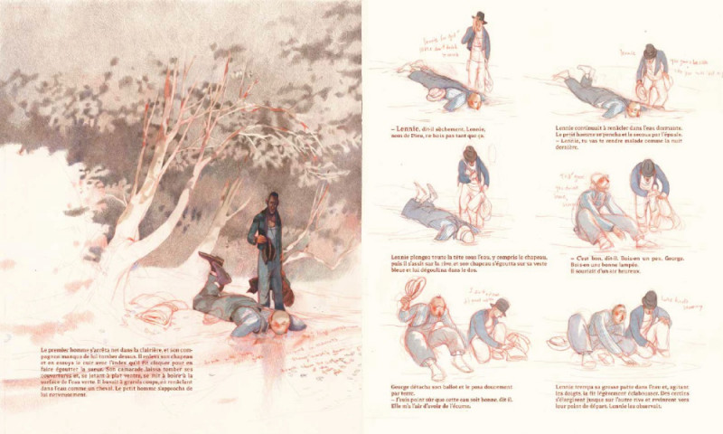 France, 2020 : Rébecca Dautremer adapte ce grand classique dans un incroyable roman graphique. Pour cette deuxième collaboration avec les éditions Tishina, après Soie il y a quelques années, elle renouvelle brillamment son univers et sa palette, et pousse plus loin que jamais son talent. Un dialogue intense entre le texte intégral de Steinbeck et l’univers artistique de la plus célèbre des illustratrices françaises.