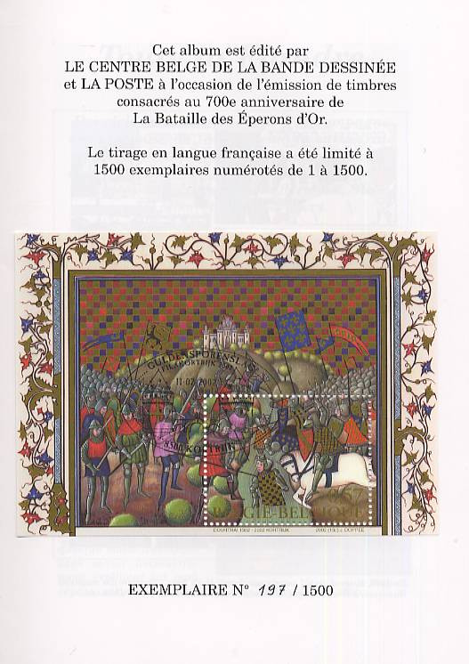 FrançaisInfo édition : Album édité par le Centre Belge de la Bande Dessinée et La Poste belge à l'occasion de l'émission de timbres consacrés au 700e anniversaire de la Bataille des Éperons d'Or. Tirage limité à 1 500 exemplaires, numérotés de 1 à 1500. Format A5. Avec le bloc-feuillet.