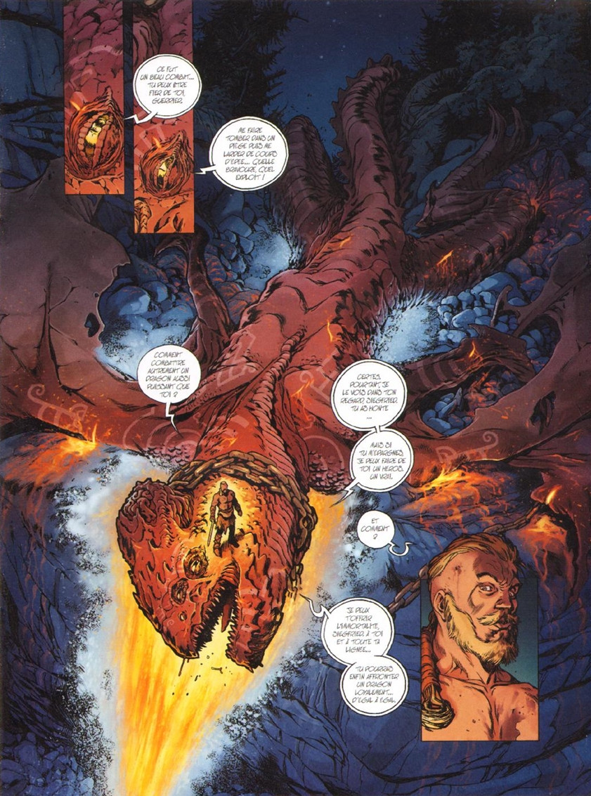 Les dragons sont des gardiens de trésors, l'affaire est entendue. Mais ces montagnes de richesses sont d’abord liées à un surprenant phénomène : au moment de la mue, les écailles de ces légendaires reptiles se transforment en or. Ce miracle, dont l’origine reste un mystère, pousse un trio atypique à se former comprenant Phylogène d’Esquamate, fils de scientifiques dracologues disparus, Wei, pirate chinois capable de dresser des dragons, et Udo Von Winkelried, descendant d’une lignée de chasseurs de dragons remontant à Siegfried. Ces trois hommes s’allient dans le but de tuer le plus gigantesque des dragons que la terre ait jamais porté. Mais pour achever une bête aussi énorme et s’emparer de l'incroyable trésor que son corps tout entier représente, une seule solution : la tuer... de l'intérieur. Ils doivent aller là où personne, avant eux, ne s'est aventuré : dans le ventre du dragon. Premier volet d’un triptyque de fantasy dans la pure tradition du genre, Dans le Ventre du Dragon propose une relecture originale du mythe de ces fascinantes créatures ailées construit autour de la thématique de la transmission familiale. Mathieu Gabella et Christophe Swal jouent avec les codes et les histoires de dragons pour nous délivrer un récit aussi documenté qu’épique et mystérieux.
