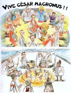 La révolte des Toges jaunes, menée par une poignée de Gaulois réfractaires met à mal le règne autoritaire de César Macronus, empereur d’une Gaule Euromaine. On y retrouve les personnages clés du mouvement : de Benallam à Théorieducomplix (Maxime Nicolle), de Castagnus (Castaner) à Colérix (Mélenchon) et Blonde de Neuillix (Marine Le Pen), sans oublier Consensus (Bayrou), médiateur fort encombrant ou Sarkozyx, "mauvais génie" de César.