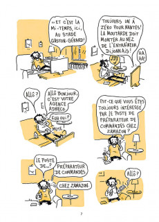 L'auteur Lénaïc Vilain devient préparateur de commande en entrepôt pour zAmazon. Un récit qui montre avec légèreté l'univers ubuesque du leader du e-commerce mondial et ce qui se cache derrière chaque commande qu'on fait en ligne. Les slogans de motivation, les cadences minutées, l'enthousiasme de rigueur pour un métier de fourmi sous monitoring et caméra de surveillance, en plein Covid.