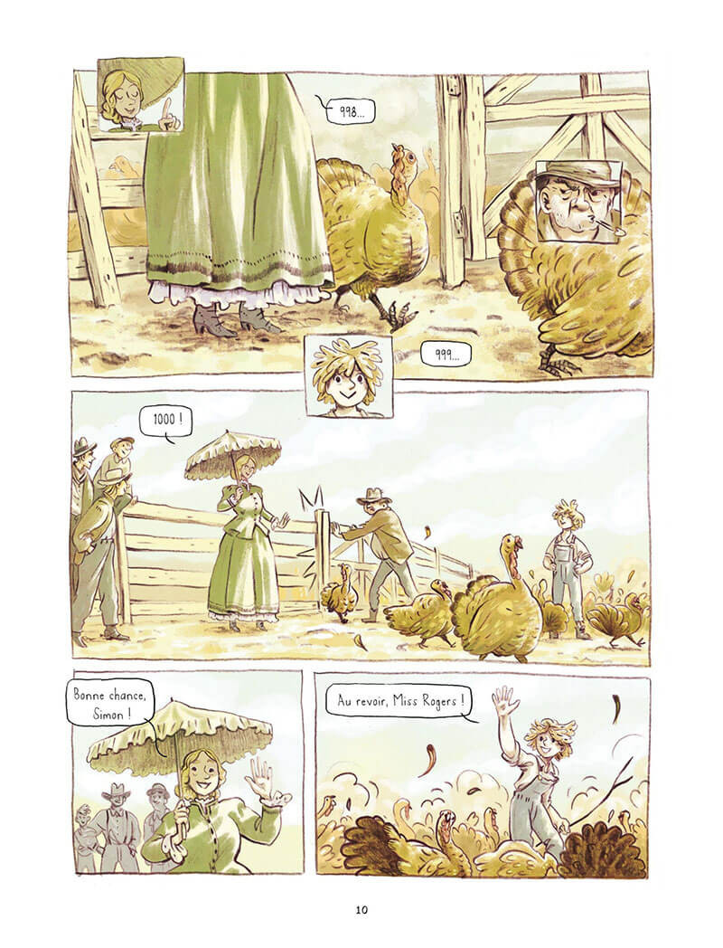 Missouri, été 1860. Après avoir quadruplé son CE1 à 15 ans, Simon diplômé d'office par Miss Rogers se voit refuser l'entrée en CE2 et doit gentiment déployer ses ailes. Aussi, le soir même de cette mauvaise nouvelle, lorsqu'il apprend que les dindes sur pattes valent 20 fois plus à Denver que chez lui, il décide d'acquérir 1000 têtes pour les convoyer sur 1000 kilomètres et prouver ainsi qu'il a le sens des affaires. Il recrute pour l'escorter une équipe improbable avec laquelle il va devoir traverser le désert, affronter les rocheuses et négocier avec les Indiens ! Ces derniers accepteront-ils de laisser passer cette étrange caravane qui doit atteindre Denver pour y faire fortune ?Le magnifique roman de Kathleen Karr adapté par l'autrice du brillant Anaïs Nin : sur la mer des mensonges, Léonie Bischoff, qui signe son premier titre jeunesse