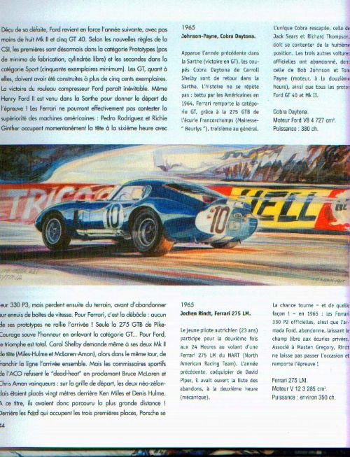 16h00 : c'est le sprint. Les pilotes sautent dans leur cockpit. Contact, les moteurs déchirent le silence tombé sur le circuit. Les cinquante voitures s'ébranlent, disparaissant une à une dans la courbe Dunlop. Instant magique de cette ronde de 24 Heures qui - hélas pour le spectacle ! - cédera sa place en 1970 à un départ en épi, pilote à bord, puis, l'année suivante, au départ lancé que nous connaissons aujourd'hui. Le Mans, dans les années 50-60, c'est aussi le défi lancé aux records de vitesse, dans l'interminable ligne droite des Hunaudières : 250, 300, 350 km/h ! C'est encore ces pilotes, ensablés à Mulsanne ou au Tertre Rouge, qui tentent de se dégager à l'aide d'une pelle. Le Mans, enfin, c'est la nuit, avec les lumières de la fête foraine et les traînées des phares qui percent inlassablement l'obscurité ; le petit jour, porteur d'espoir pour les concurrents encore en piste et la pluie, si fréquente à cette époque de l'année, qui rend la course encore plus incertaine, en tout cas plus dangereuse ; les ravitaillements et les pannes qu'on essaye de réparer, souvent en vain ; la joie des vainqueurs et la liesse populaire qui suit l'arrivée. Une fête à nulle autre pareille, dont constructeurs et pilotes ont toujours rêvé d'être roi...