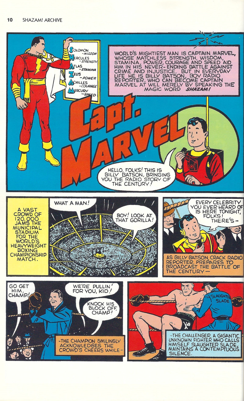 Given powers by an ancient and mysterious wizard, boy reporter Billy Batson need only say the word Shazam and he is transformed into the powerful adult hero Captain Marvel. Reprinting the early 1940s tales of the World's Mightiest Mortal, this beautiful book includes classic stories in which Captain Marvel battles the heavyweight boxing champion and his super-intelligent gorilla companion, breaks up a murderous gambling ring, investigates curious occurrences at a haunted house, fights a deadly ancient vampire, breaks up a cattle rustling ring, meets his match in a robotic adversary and fights his hypnotized ally Spy Smasher.