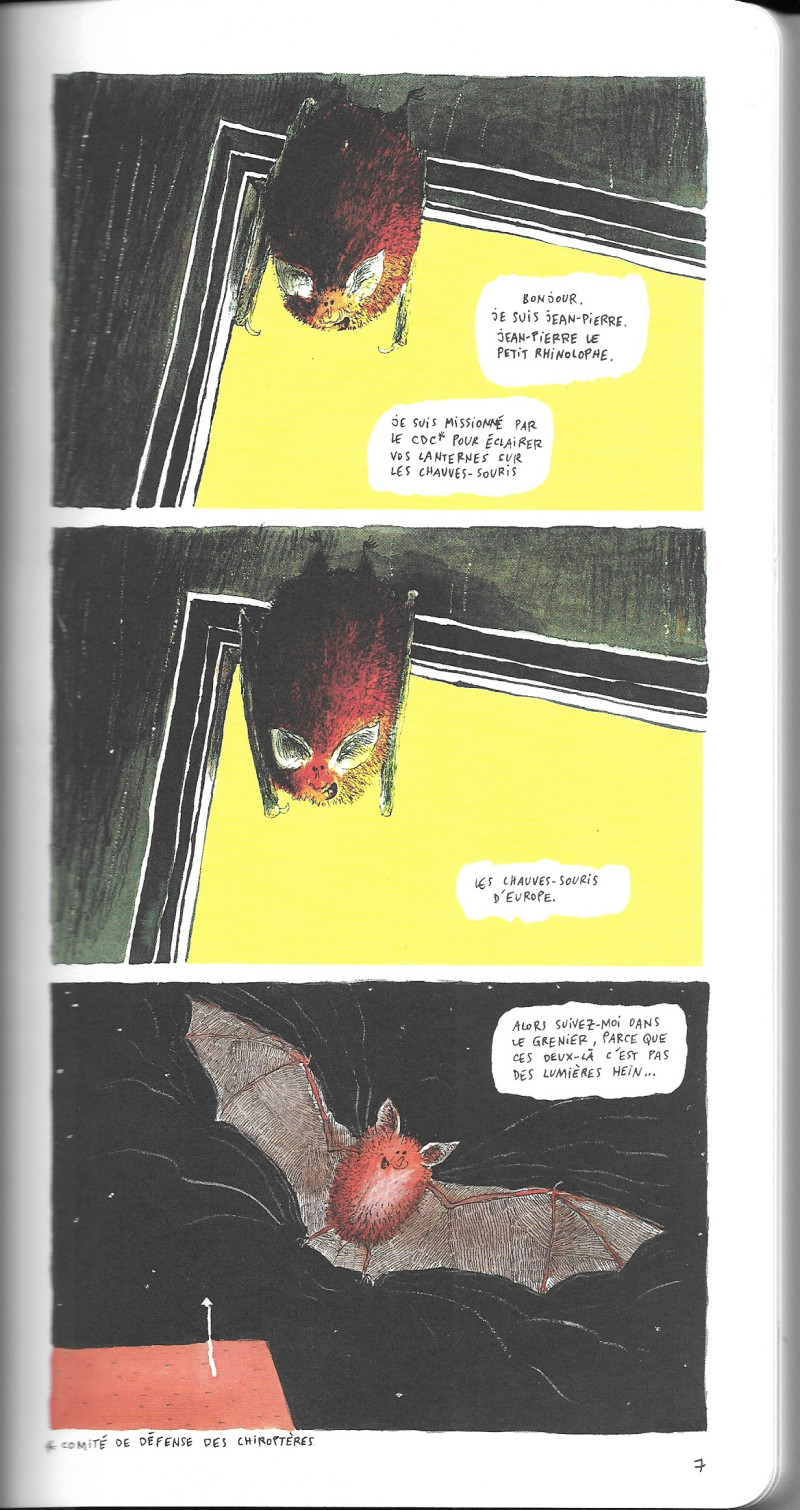 L’illustrateur Sébastien Cazes met en scène une chauve-souris pédagogue qui s’amuse à observer deux scientifiques chiroptérologues, dont l’un se prénomme Laurent (sic), qui s’interrogent sur leur compte. Une mise en abyme pleine de tendresse permettant de découvrir des pans entiers de leur vie quotidienne. L’humour omniprésent, la narration décentrée, le trait délicat à la plume et aux crayons de couleur, alliant la poésie à la finesse et à la précision scientifique, permettent de mettre ce livre entre toutes les mains.