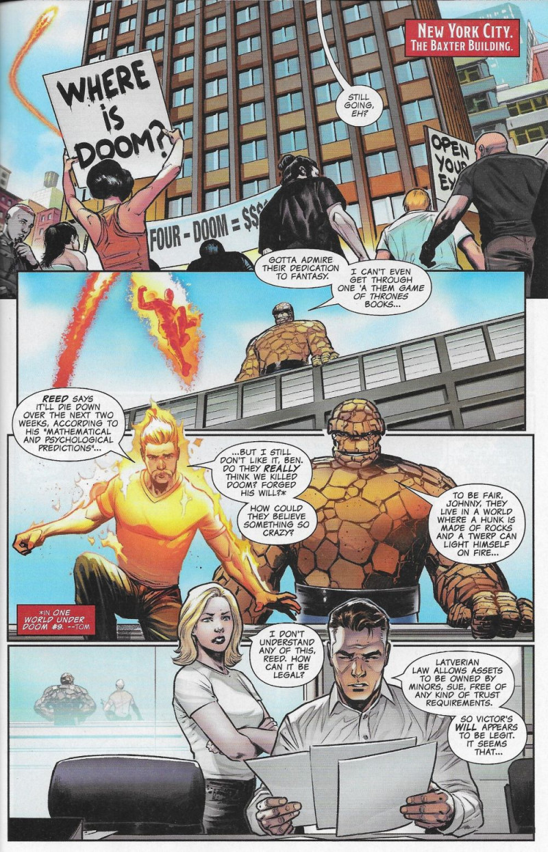 LONG LIVE, DOOM! As the Fantastic Four deal with the fallout from ONE WORLD UNDER DOOM, they're faced with big questions and a surprising new global menace! Will the White House have their backs? Will…the RED HULK? The next stage of the Marvel Universe starts here!